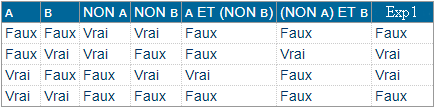 Ces opérateurs sont parfaitement définis par leur table de vérité :